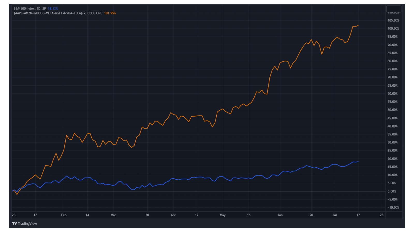 Since the market bottom of October 2022, the Magnificent 7 ($APPL, $AMZN, $GOOGL, $META, $MSFT, $NVDA, $TSLA) has risen almost 75% weekly, outperforming .SPX by three fold. Since the beginning of 2023 it's up over 100%, outpacing .SPX and holding up the S&P's other 493 stocks.